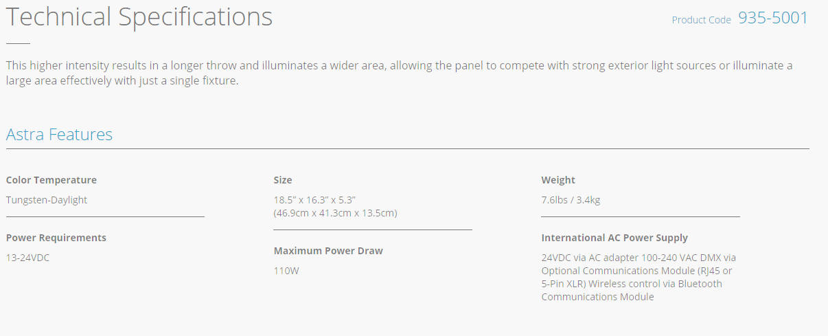 - Optional communications module allows the brightness, color temperature, and cooling mode to be controlled via DMX or Bluetooth