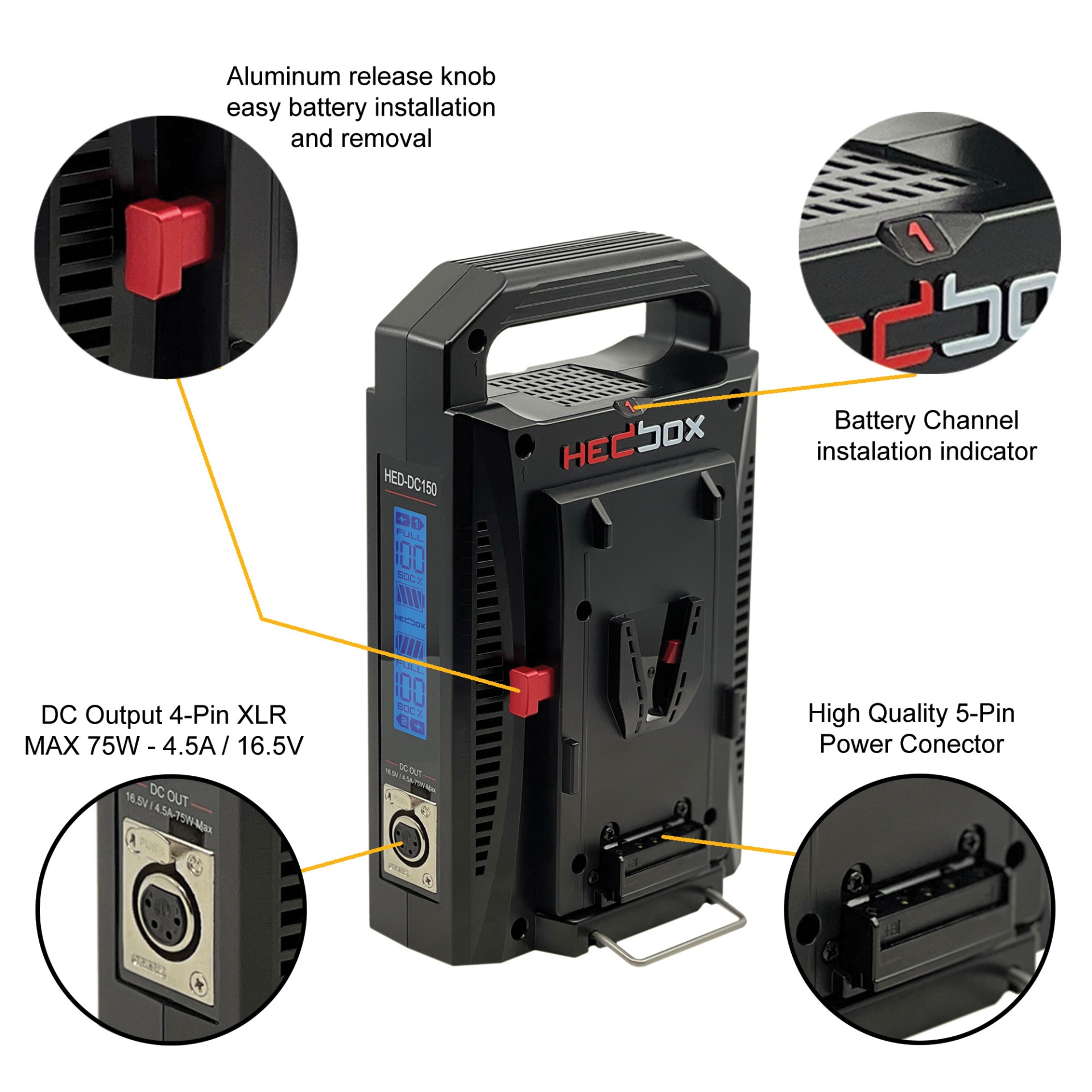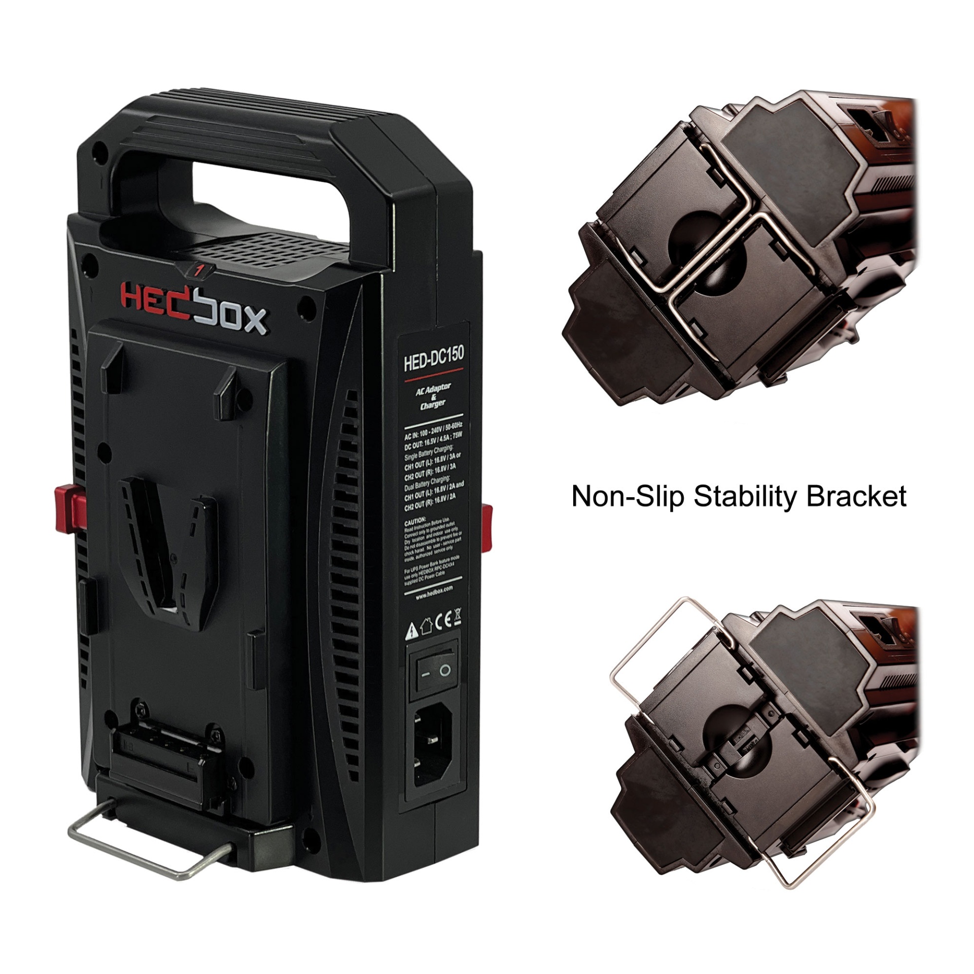 Hedbox PROBANK-2XL is an Intelligent Digital Dual Battery Charger system with two V-Mount (V-Lock) Batteries featuring simultaneous charging and UPS/Power Bank capabilities.