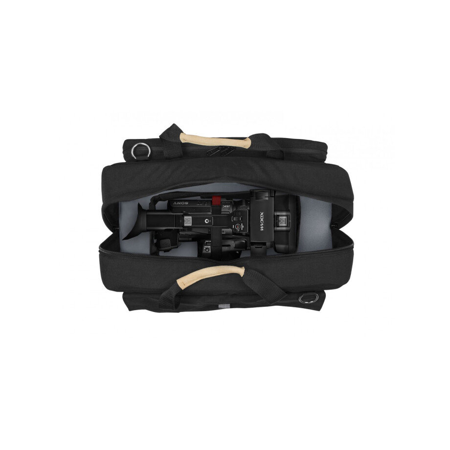 The CS-PXWZ190 Camera Case is a 1000-denier Cordura nylon case with 1.0" thick interior foam padding. It has a quick access main compartment with a CR Universal adjustable camera cradle that holds the camcorder securely in place on the bottom of the case. The case is designed to carry and protect various model camcorders and accessories up to approximately 17" long. The CS-PXWZ190 case has a removable, small, padded pouch, one large exterior pocket that holds a rain cover, cables etc. and a wide slip pocket for white balance card, owner's manual, maps, airline tickets, etc. A white balance card is included. The case is carried by two suede leather-covered hand grips or a removable, adjustable shoulder strap with suede leather-covered pad.