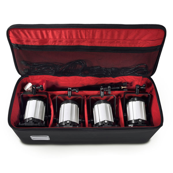 A lightweight, semihard carrier that holds up to 4 light heads and 4 stands up to 34.65" (88 cm) long. Internal dividers separate the main chamber into sections for storing accessories.